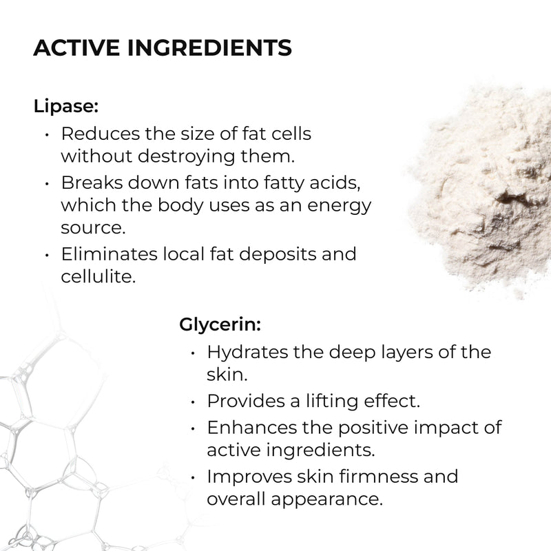 Połączenie aktywnych enzymów lipazy i hialuronidazy, przenikając do głębokich warstw naskórka i skóry właściwej, hamuje rozwój tkanki tłuszczowej, rozkłada istniejące nadmierne złogi tłuszczowe, zrosty włókniste oraz redukuje obrzęki w tkankach dotkniętych cellulitem.