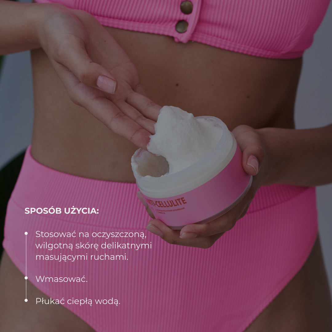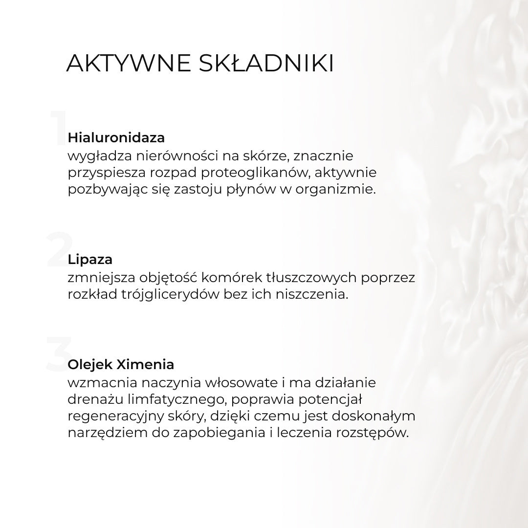 restrukturyzuje powierzchnię skóry (wygładza i wyrównuje, eliminuje "skórkę pomarańczową");