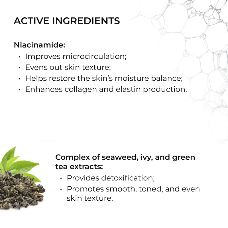 Ekstrakty alg morskich, bluszczu i zielonej herbaty działają na detoksykację skóry, pomagając utrzymać ją zdrową, gładką i jędrną. Zielona herbata i algi posiadają również właściwości antyoksydacyjne, które pomagają chronić skórę przed uszkodzeniami i stanami zapalnymi.