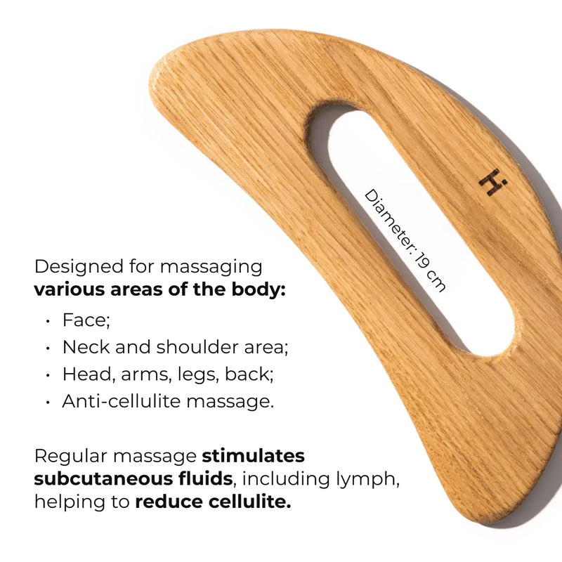 Zestaw zawiera drewniany skrobak do masażu gwaszowego, który stymuluje limfę, i eliminuje cellulit.