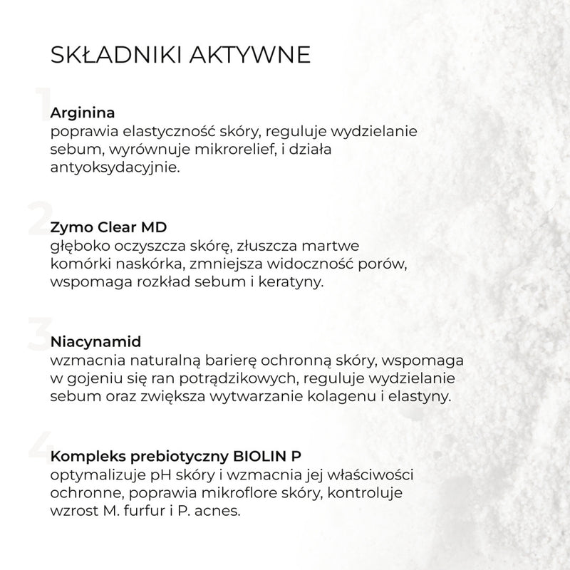 - głęboko oczyszcza skórę, w szczególności skórę łojotokową i trądzikową;