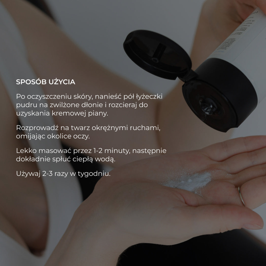 Po oczyszczeniu skóry nałoż pół łyżeczki pudru na zwilżone dłonie i rozetrzej do uzyskania kremowej piany. Nakładaj na twarz okrężnymi ruchami, omijając okolice oczu. Lekko wmasuj w skóre przez 1-2 minuty, a następnie dokładnie spłuć ciepłą wodą. Puder należy stosować 1-2 razy w tygodniu.