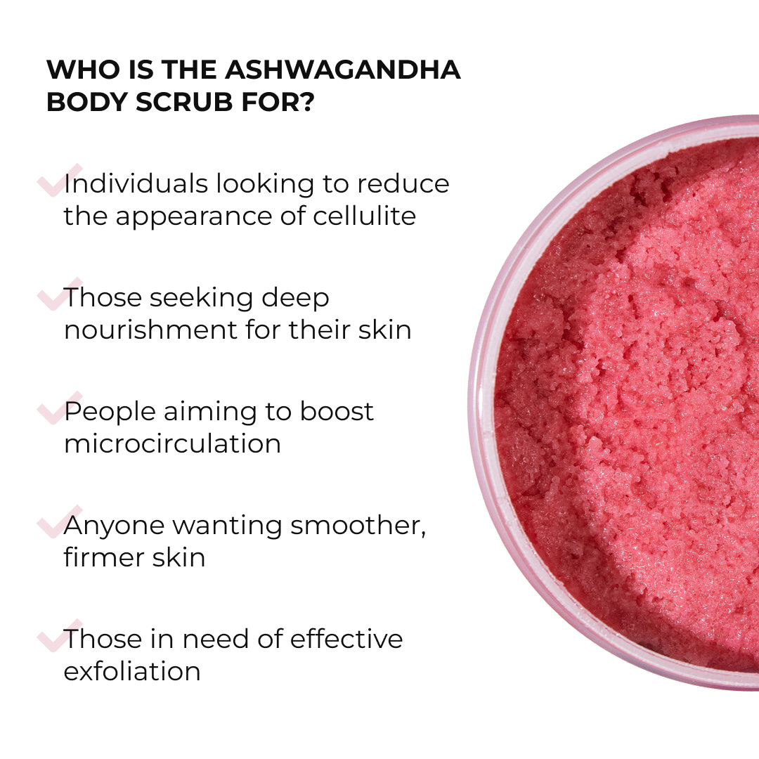 Jedwabisty różowy peeling do ciała z ekstraktem z Ashwagandhy to luksusowy rytuał pielęgnacyjny, który łączy skuteczne złuszczanie, głębokie nawilżenie oraz działanie antycellulitowe.