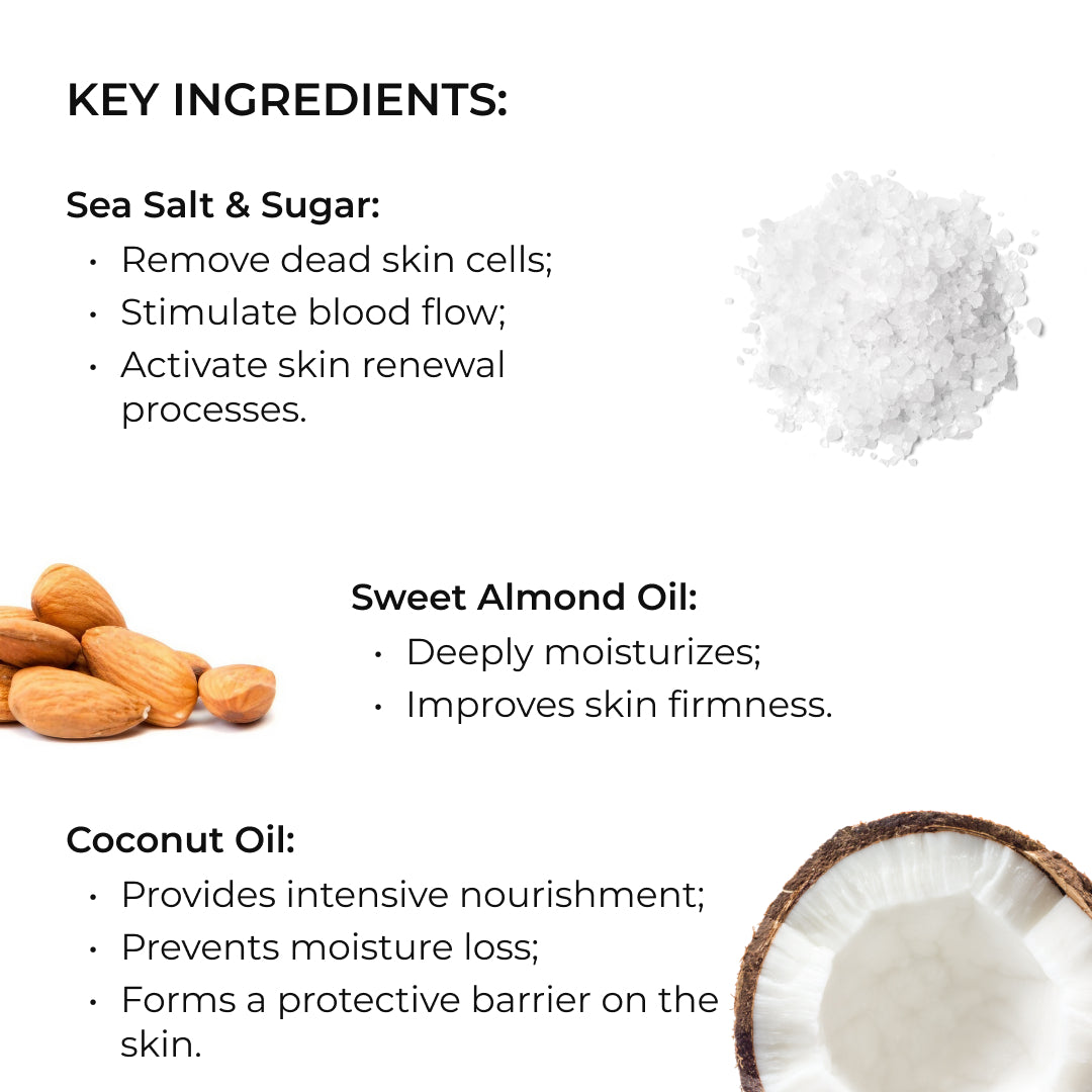 Sól morska i cukier – naturalne eksfolianty, które delikatnie usuwają zrogowaciały naskórek, stymulują krążenie krwi i aktywują procesy odnowy skóry. Olej ze słodkich migdałów głęboko nawilża, poprawia jędrność skóry i sprawia, że staje się bardziej elastyczna. Olej kokosowy zapewnia odżywienie, zmiękcza skórę i tworzy ochronną barierę, zapobiegając utracie wilgoci.