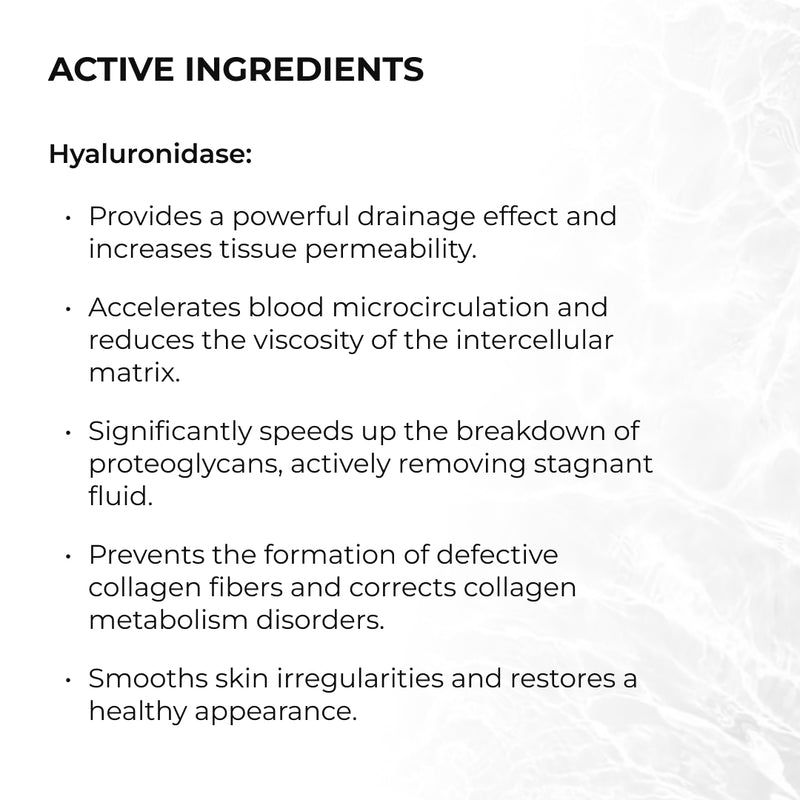 Połączenie aktywnych enzymów lipazy i hialuronidazy, przenikając do głębszych warstw naskórka i skóry właściwej, hamuje wzrost tkanki tłuszczowej, rozbija istniejące nadmiary tłuszczu, zrosty włókniste i łagodzi obrzęki tkanek dotkniętych cellulitem.