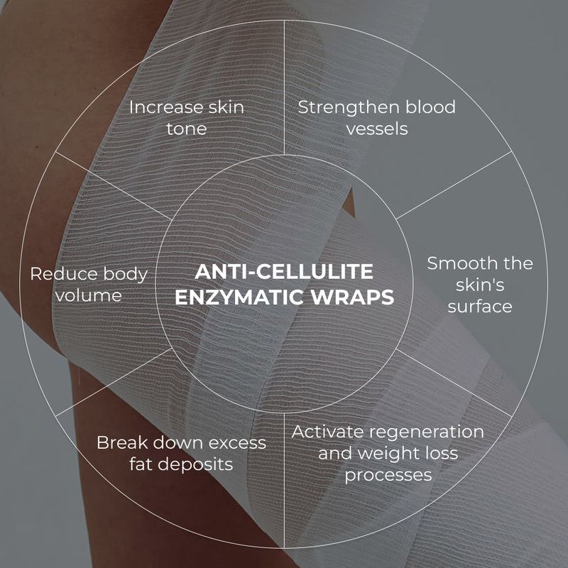 Zabieg redukujący cellulit, poprawiający napięcie skóry i wzmacniający naczynia krwionośne. Bandaże nasączone płynem zawierającym aktywny enzymatyczny kompleks antycellulitowy Zymo Cell.