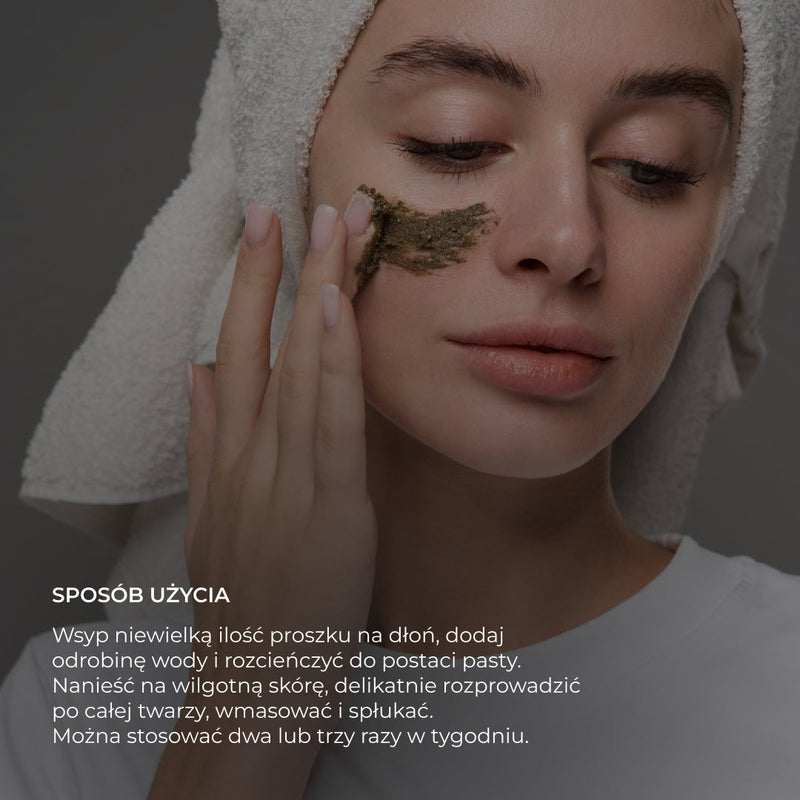 - Wsyp niewielką ilość proszku ubtan na dłoń, dodaj odrobinę wody i rozcieńcz do konsystencji przypominającej pastę. Nałóż na wilgotną skórę, delikatnie rozprowadzić na całej twarzy, wmasować i spłukać. Można stosować dwa lub trzy razy w tygodniu.
