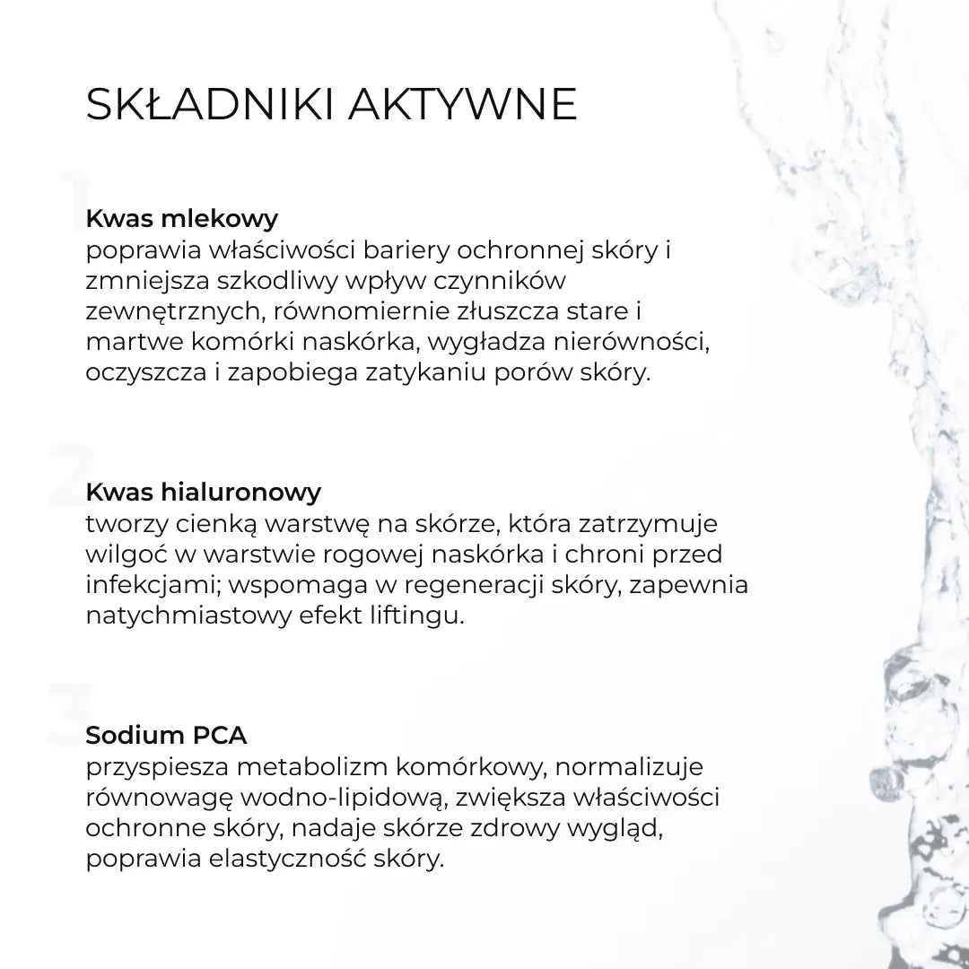 Tonik z kwasem mlekowym do cery tłustej i problematycznej nawilża i neutralizuje działanie wolnych rodników. Przyspiesza proces odnowy komórkowej i stymuluje syntezę kolagenu. Zapobiega powstawaniu zaskórników, działa przeciwzapalnie. Pomaga wygładzić relief skóry, normalizuje pracę gruczołów łojowych i zapobiega dalszemu gromadzeniu się zanieczyszczeń.