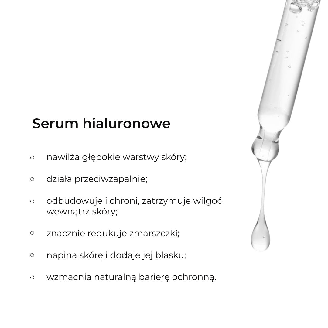Serum hialuronowy nawilża głębokie warstwy skóry, zapobiega starzeniu i przywraca młodzieńczy wygląd skóry, odbudowuje i chroni, zatrzymuje wilgoć wewnątrz skóry, widocznie redukuje zmarszczki, napina skórę i dodaje jej blasku. Podczas masażu właściwości serum hialuronowego są znacznie wzmocnione.
