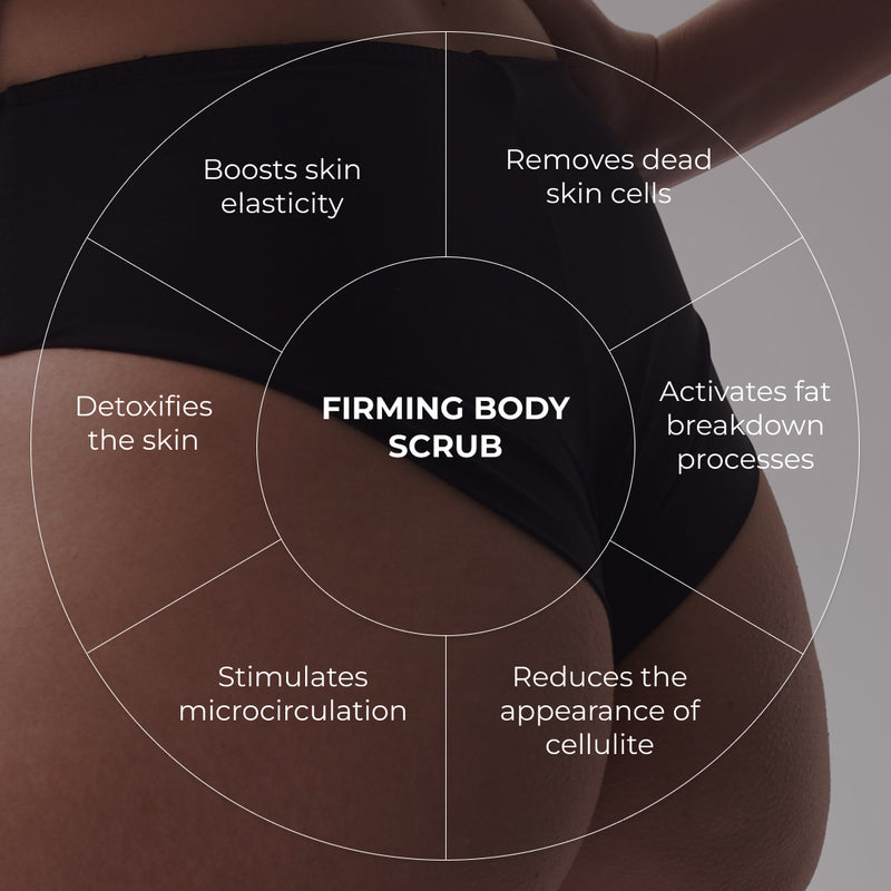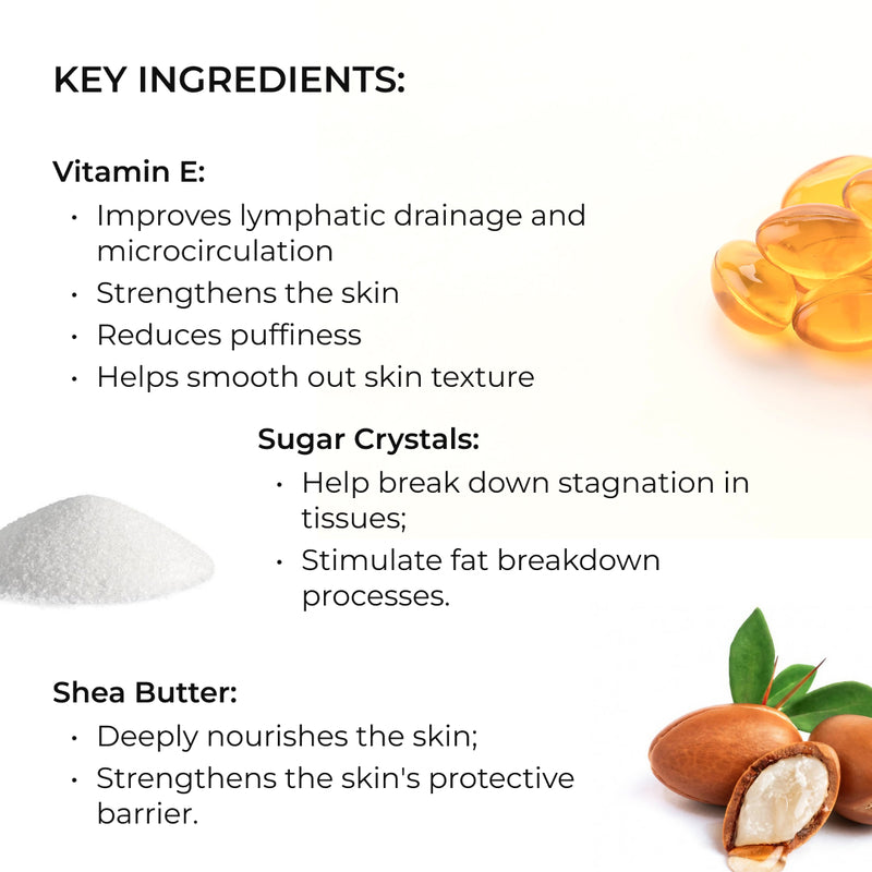 Olej migdałowy i olej z pestek winogron zapewniają głębokie nawilżenie i wspierają jędrność skóry. Ten peeling skutecznie zmniejsza widoczne objawy cellulitu, poprawia strukturę i ogólny wygląd skóry.