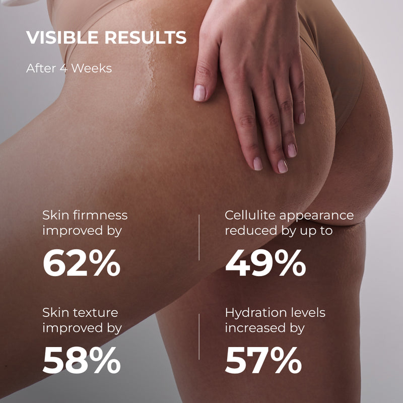 Po 4 tygodniach jędrność skóry wzrosła o 61%, co świadczy o znaczącej poprawie jej elastyczności. Tekstura skóry poprawiła się o 56%, dzięki czemu skóra wygląda na gładszą i bardziej wyrównaną. Objawy cellulitu zmniejszyły się o 53%, co stanowi istotne osiągnięcie w walce z nim. Poziom nawilżenia skóry zwiększył się o 69%, zapewniając jej miękkość i komfort.