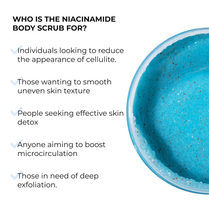 Modelujący peeling do ciała z niacynamidem poprawia mikrokrążenie i wyrównuje strukturę skóry. Drobinki cukru i rozdrobnionych łupin migdałów delikatnie złuszczają zrogowaciały naskórek, aktywując procesy odnowy skóry i stymulując krążenie krwi.
