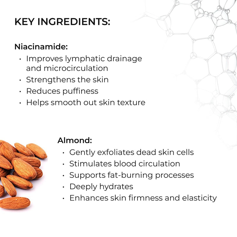Niacynamid wspomaga poprawę mikrokrążenia, pomaga wyrównać strukturę skóry i zmniejsza zastoje w tkankach. Wspiera także regenerację skóry, redukując oznaki zmęczenia i stresu. L-karnityna aktywnie wspomaga procesy spalania tkanki tłuszczowej, pomagając zmniejszyć widoczność cellulitu. Dodatkowo zwiększa jędrność skóry, czyniąc ją bardziej elastyczną i napiętą.