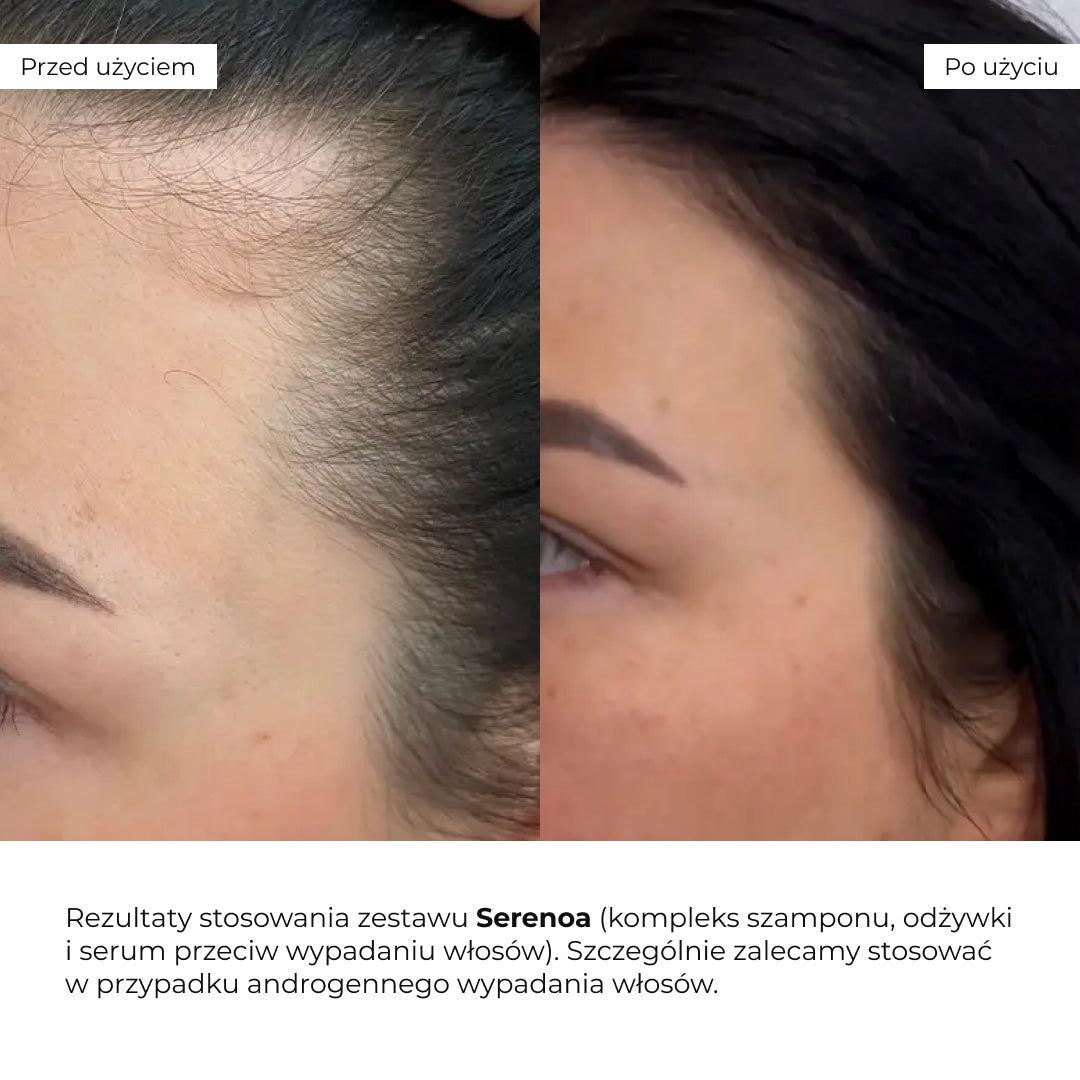 Odżywka aktywnie nawilża, odżywia i odbudowuje włosy. Bedą one miękkie, jedwabiste, elastyczne i sprężyste. Zmniejsza porowatość, zwiększając naturalny połysk. Natomiast silnie skoncentrowany kompleks do włosów z ekstraktem z palmy sabałowej CONSENTRATE SERENOA ma za zadanie aktywować mieszki włosowe, które znajdują się w fazie uśpienia. Odbudowuje włosy, dodaje im siły, po użyciu produktu są podatne na układanie.