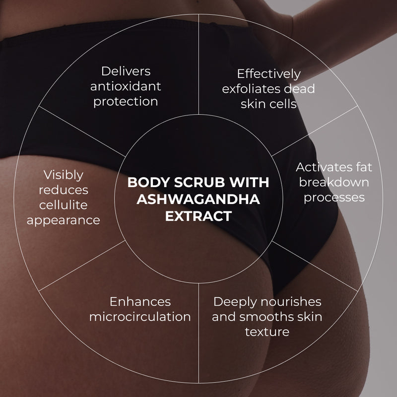 Jedwabisty różowy peeling do ciała z ekstraktem z ashwagandhy delikatnie złuszcza zrogowaciały naskórek, aktywując procesy odnowy i stymulując krążenie krwi. Peeling nie tylko skutecznie oczyszcza, ale także poprawia mikrokrążenie, nadając skórze uczucie gładkości i miękkości.