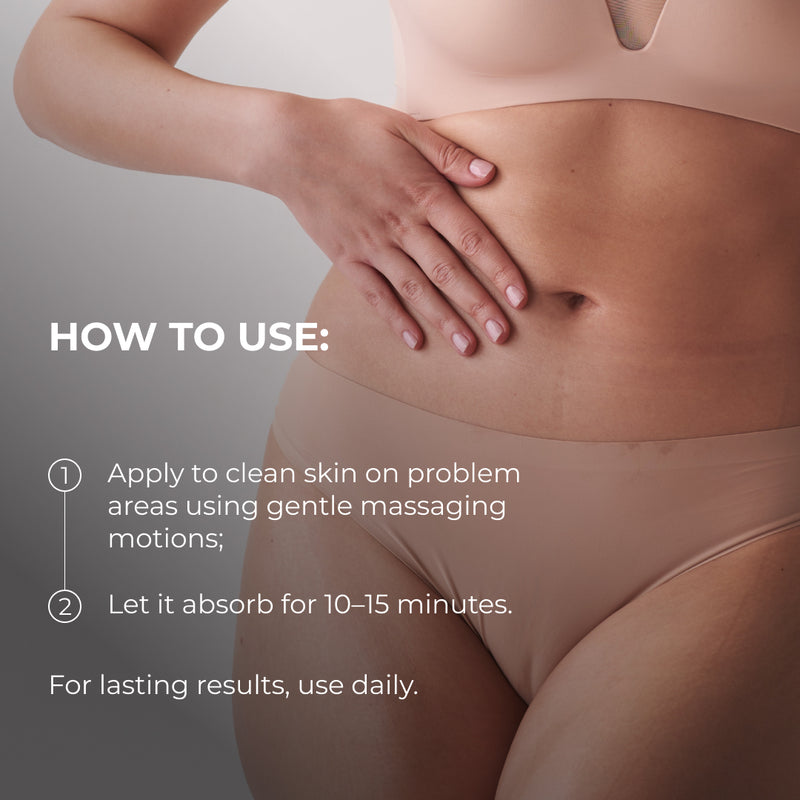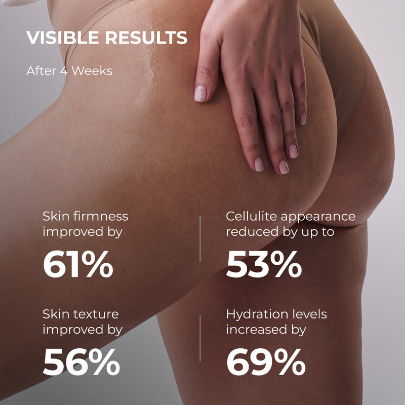 Po 4 tygodniach jędrność skóry zwiększyła się o 61%, co świadczy o znaczącej poprawie jej napięcia i elastyczności. Struktura skóry poprawiła się o 58%, co zapewniło gładszy i bardziej równomierny wygląd. Oznaki cellulitu zmniejszyły się o 32%, a poziom nawilżenia skóry wzrósł o 49%, co zapewniło uczucie miękkości i komfortu.
