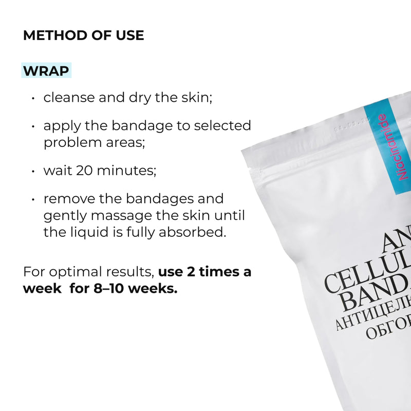 - Antycellulitowe modelujące bandaże do ciała z niacynamidem. Nałożyć bandaż na wybrane problematyczne obszary czystej, suchej skóry. Poczekać 20 minut. Zdjąć bandaże i delikatnie masować skórę, aż cała substancja się wchłonie.