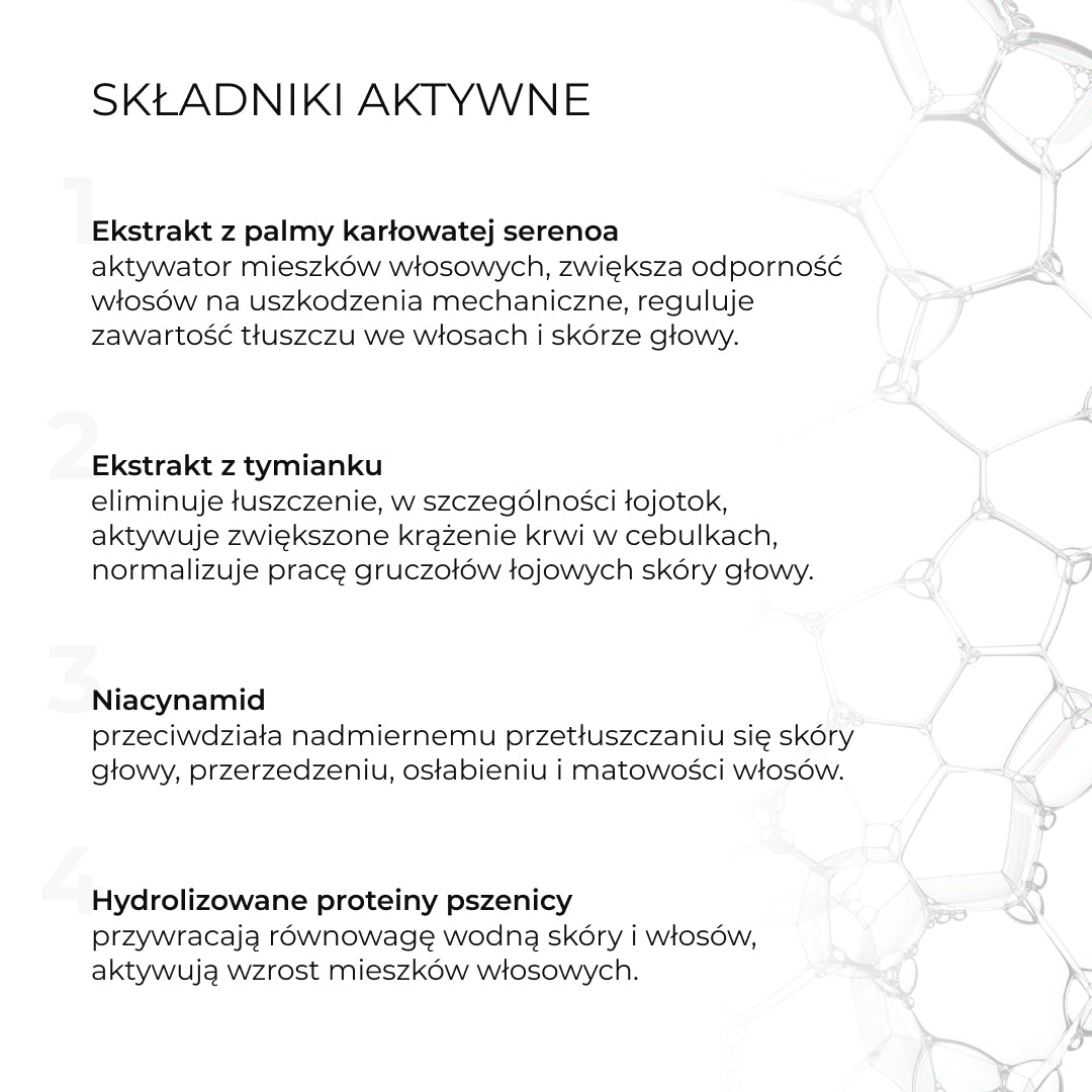 - Nałożyć szampon na mokre włosy i skórę głowy. Masować skórę przez 2-3 minuty. Spłukać wodą. Powtórzyć 2-3 razy. W profilaktyce i sezonowym wypadaniu włosów stosować 2-3 razy w tygodniu przez 1-2 miesiące. W przypadku intensywnej terapii wypadania włosów stosować przez 1-3 miesiące. W przypadku łysienia androgenozależnego stosować na stałe.