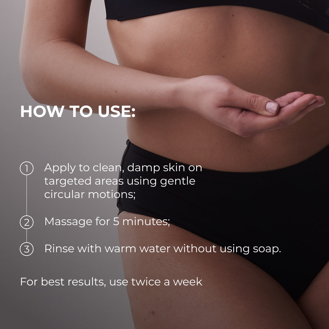 Sposób użycia: nałożyć na oczyszczoną, wilgotną skórę problematycznych partii ciała, wykonując lekkie ruchy masażowe. Masować przez 5 minut. Spłukać ciepłą wodą bez użycia mydła. Dla trwałego efektu stosować 2 razy w tygodniu.