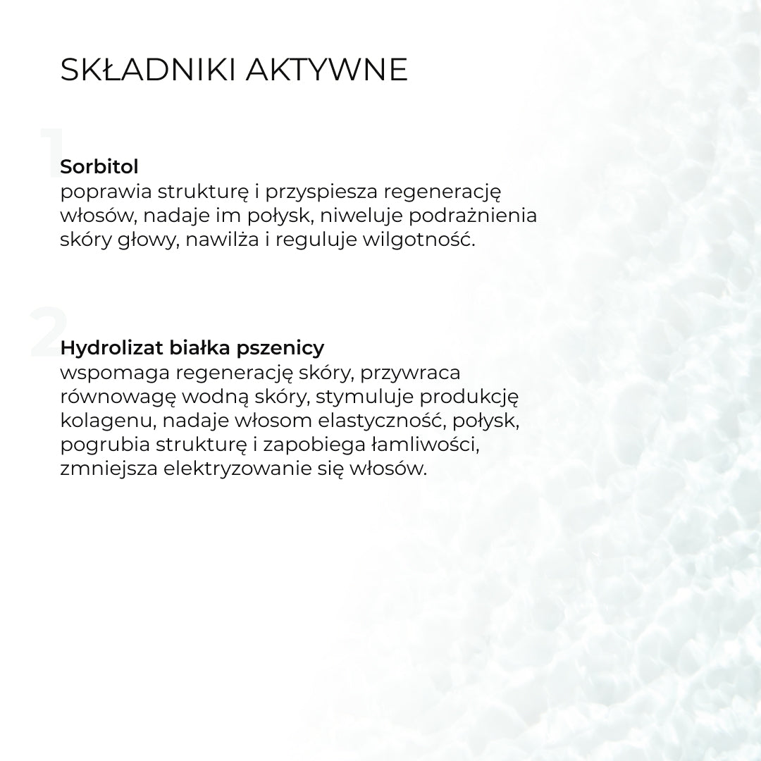 Odbudowuje strukturę włosów, nasycając je proteinami pszenicy.