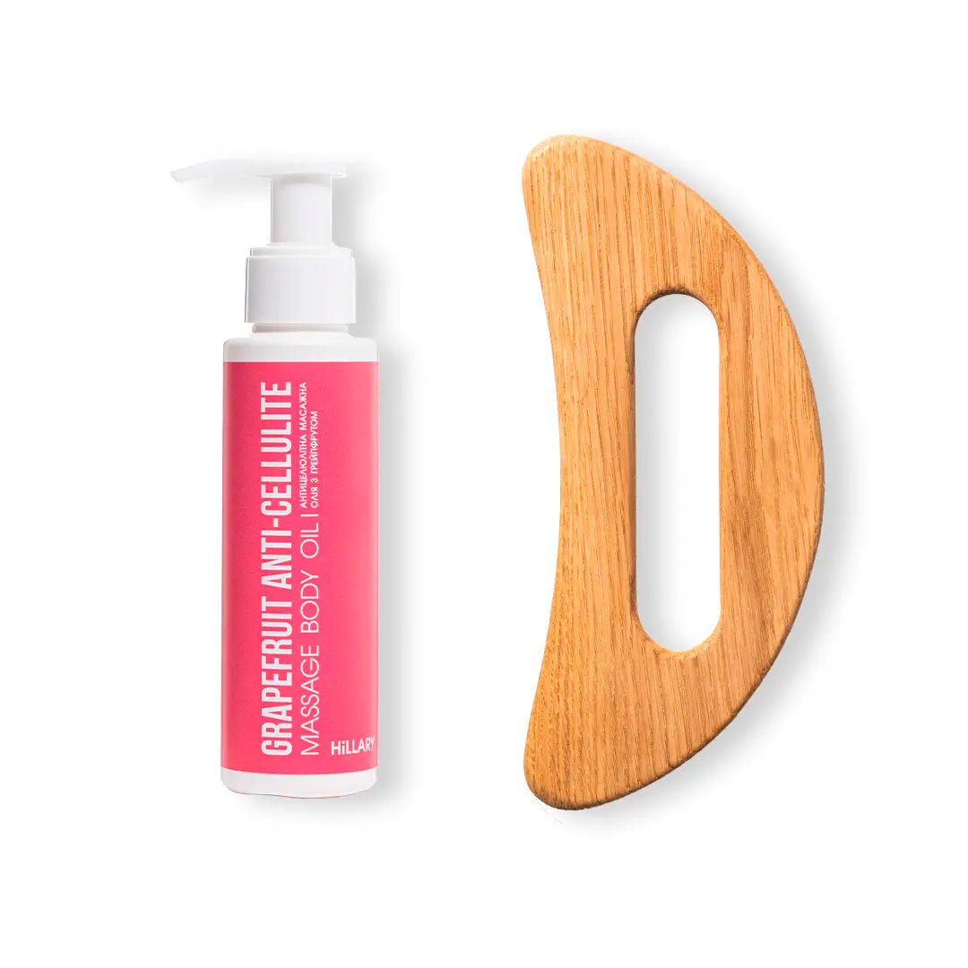 Zestaw zawiera drewniany skrobak, który stymuluje przepływ płynów podskórnych, w tym limfy, w celu pozbycia się cellulitu, oraz antycellulitowy olejek grejpfrutowy.