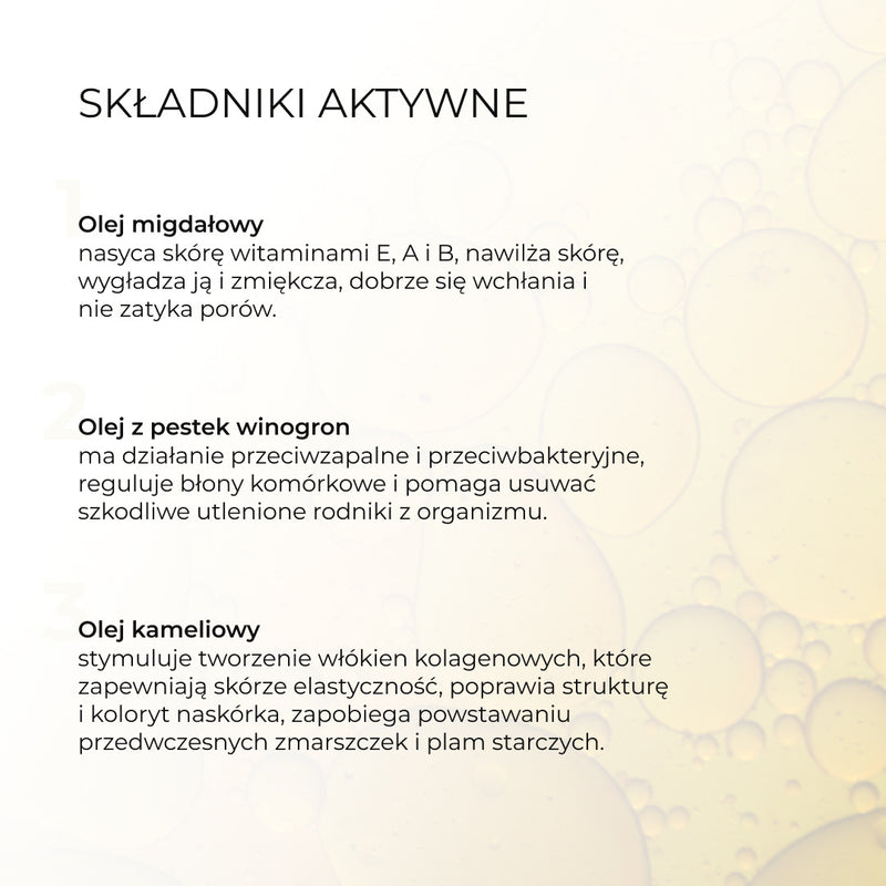 Składniki INCI: Aqua, Sodium Сoco-Sulfate, Lauryl Glucoside, Glycerin, Panthenol, Prunus Amygdalus Dulcis (Sweet Almond) Oil, Vitis Vinifera (Grape) Seed Oil, Camellia Oleifera Seed Oil, Olea Europaea (Olive) Fruit Oil, Macadamia Ternifolia Nut Oil, Citric Acid, Phenoxyethanol, Ethylhexylglycerin, Parfum.