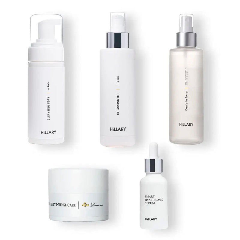 - Serum i krem: Na oczyszczoną skórę nałóż serum hialuronowe oraz Hillary Corneotherapy Intense Care 5 oil, aby nawilżyć, odbudować i chronić skórę przez cały dzień.