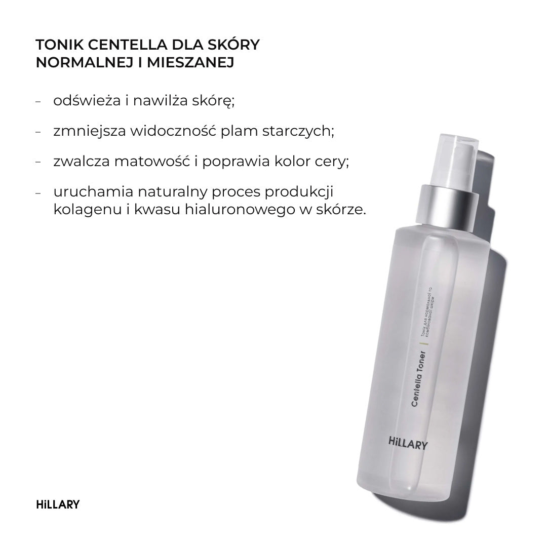 - Tonik: Nałóż Hillary Centella Toner na oczyszczoną skórę, aby ją odświeżyć i nawilżyć.