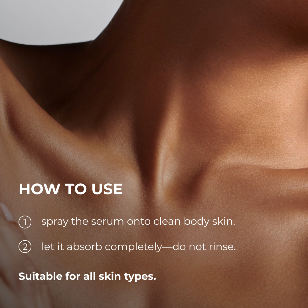 Sposób użycia: rozpylić produkt na czystą skórę ciała i pozostawić do całkowitego wchłonięcia. Dla dodatkowego nawilżenia i wzmocnienia efektu zalecamy stosowanie po serum balsamu detoksykującego do skóry problematycznej z kwasem salicylowym. Odpowiedni dla każdego typu skóry.