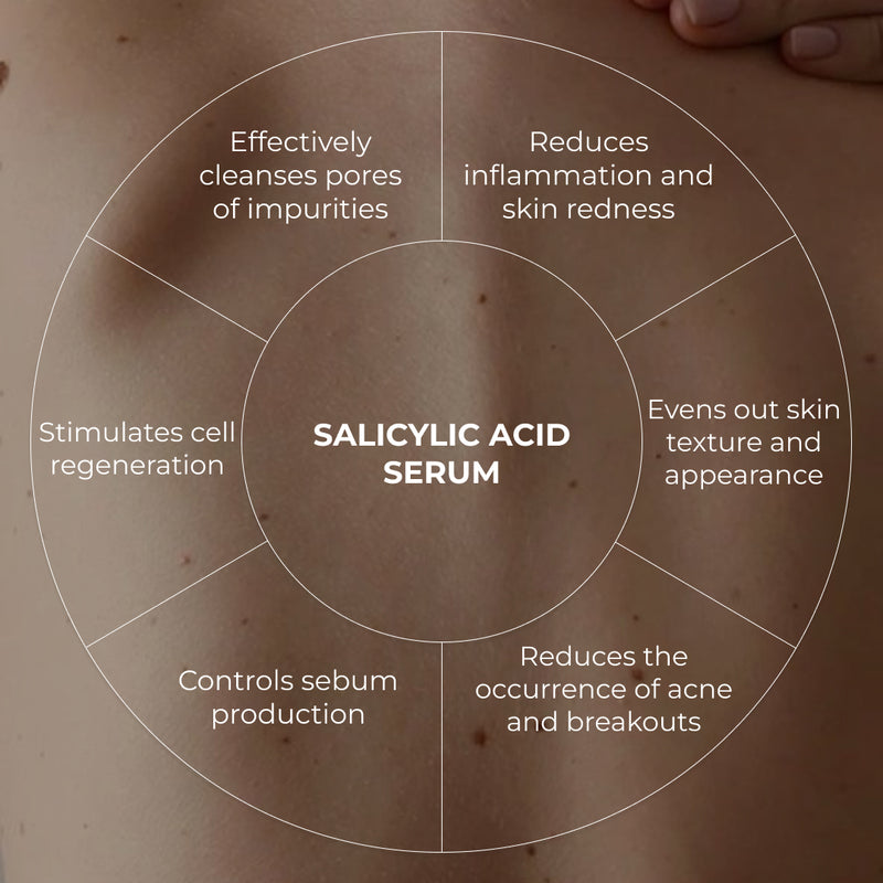 Serum do skóry skłonnej do trądziku z kwasem salicylowym to skuteczny preparat do oczyszczania, walki z wypryskami i stanami zapalnymi na plecach oraz ciele. Dzięki kwasowi salicylowemu (2%) i niacynamidowi nie tylko oczyszcza pory, ale także poprawia ogólny wygląd skóry, sprawiając, że staje się ona gładka i zdrowa.