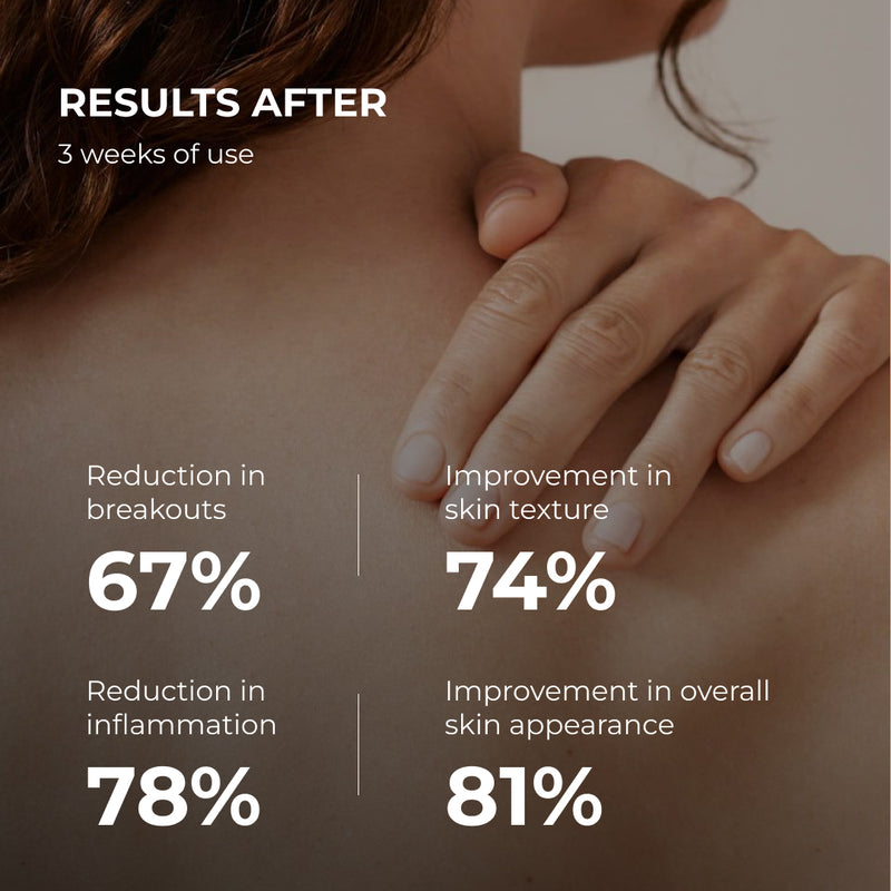 Badania wykazały, że stosowanie serum Hillary Back & Body Acne Control Serum pomaga zmniejszyć wypryski o 67%, poprawić teksturę skóry o 74% oraz zredukować stany zapalne o 78%. Dzięki zawartości kwasu salicylowego serum skutecznie kontroluje wydzielanie sebum i przyczynia się do poprawy ogólnego wyglądu skóry aż o 81%.