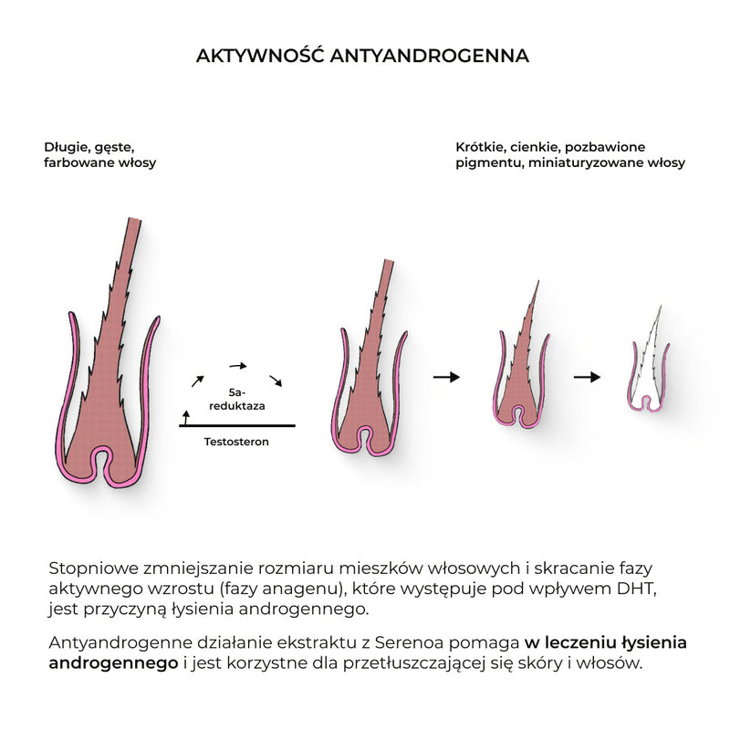 - Stymuluje przyspieszenie przejścia z fazy telogenu do fazy anagenu (wzrostu włosów).