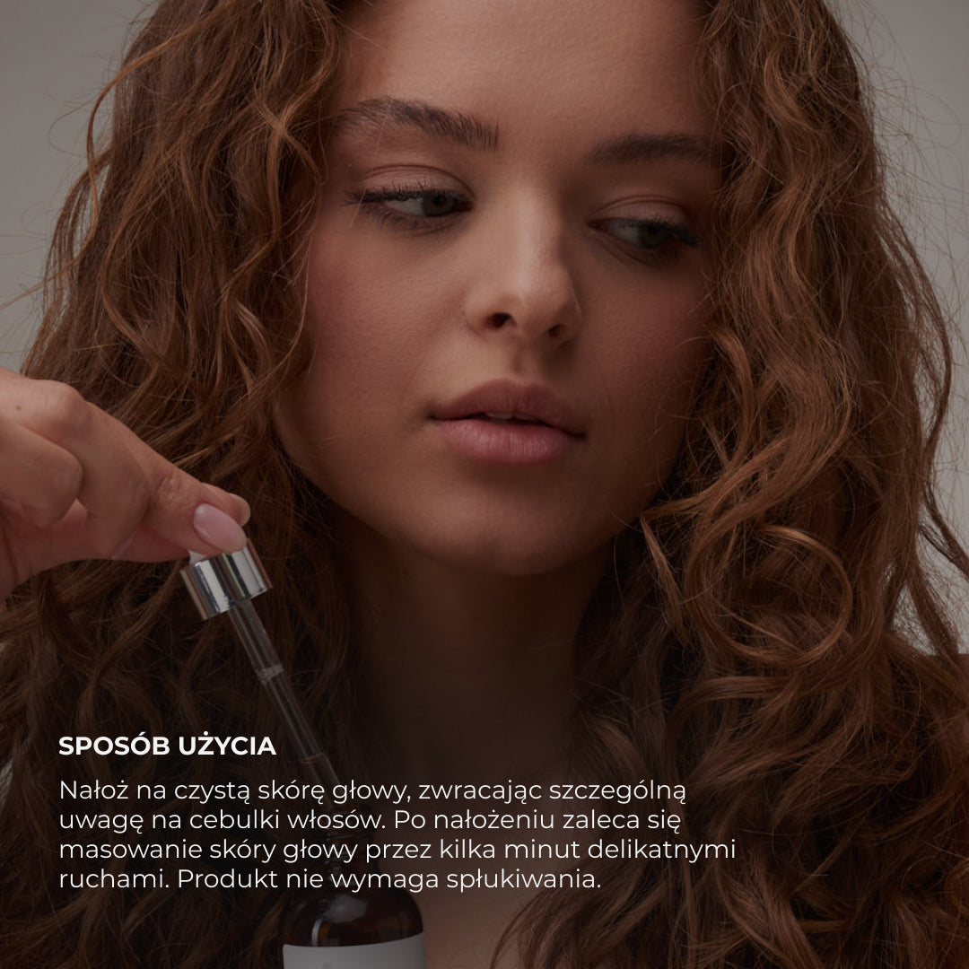 Nałoż na czystą skórę głowy, zwracając szczególną uwagę na cebulki włosów. Produkt nie wymaga spłukiwania. Po aplikacji zaleca się masowanie skóry głowy przez kilka minut delikatnymi ruchami. Stosować po każdym umyciu włosów szamponem.