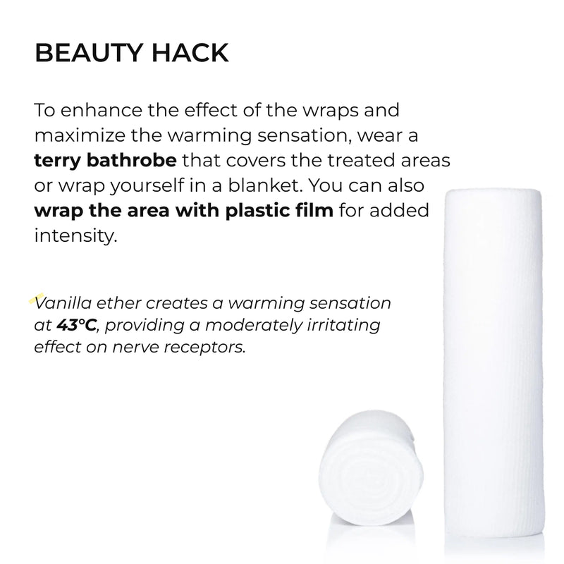 Zwróć uwagę! Produkt jest wysoko aktywny, dlatego może powodować uczucie pieczenia, które jest normalną reakcją skóry. Stopień działania rozgrzewającego bandażu waha się od umiarkowanego do silnego, w zależności od indywidualnej wrażliwości skóry. Latem wrażliwość skóry na rozgrzewające działanie ekstraktu z wanilii może być zwiększona. Jeśli odczuwasz silne pieczenie, skróć czas namaczania bandaży do 10 minut. Nie spłukuj pozostałości produktu wodą, w przeciwnym razie uczucie pieczenia nasili się. Przetarcie skóry wacikiem nasączonym olejem pomoże złagodzić uczucie pieczenia. Przecierać lekkimi ruchami bez nadmiernego nacisku. Efekt rozgrzewający utrzymuje się przez kolejne 40-60 minut po zdjęciu bandaży.