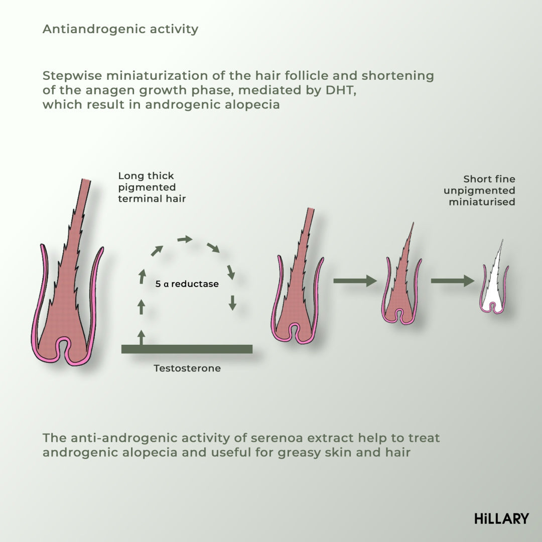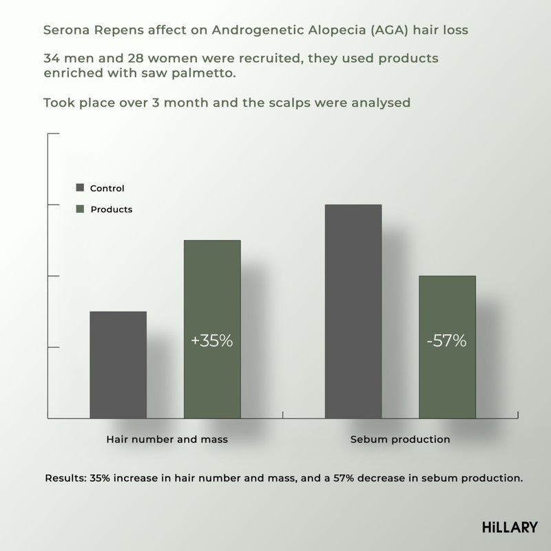 Kwas nikotynowy (znany również jako niacynamid, witamina PP, witamina B) wpływa na naczynia skóry głowy, rozszerzając je, poprawiając krążenie krwi i procesy metaboliczne. Ekstrakt z Serenoa przedłuża cykl życia włosów, co skutkuje zmniejszeniem ich wypadania. Leczy skórę, przywracając i utrzymując prawidłową mikroflorę.