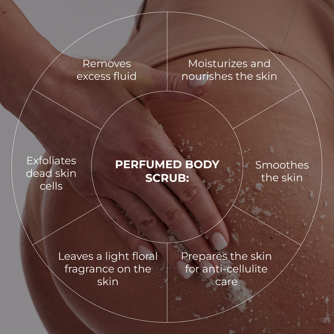 Idealna kombinacja dla Twojego ciała! Perfumowany scrub złuszczy martwe komórki skóry, nadając jej gładkość dzięki cukrowym granulkom. Nawilży i odżywi skórę dzięki zawartym w nim olejom, usunie nadmiar płynów, przygotowując skórę do antycellulitowej pielęgnacji, pozostawiając na skórze lekki kwiatowy zapach. Szczotka do masażu z włosiem sizalowym wyrówna relief skóry i kontury ciała, zwiększając jej elastyczność i jędrność, przyczyni się także do złuszczania martwych komórek naskórka i stymulacji procesów metabolicznych.