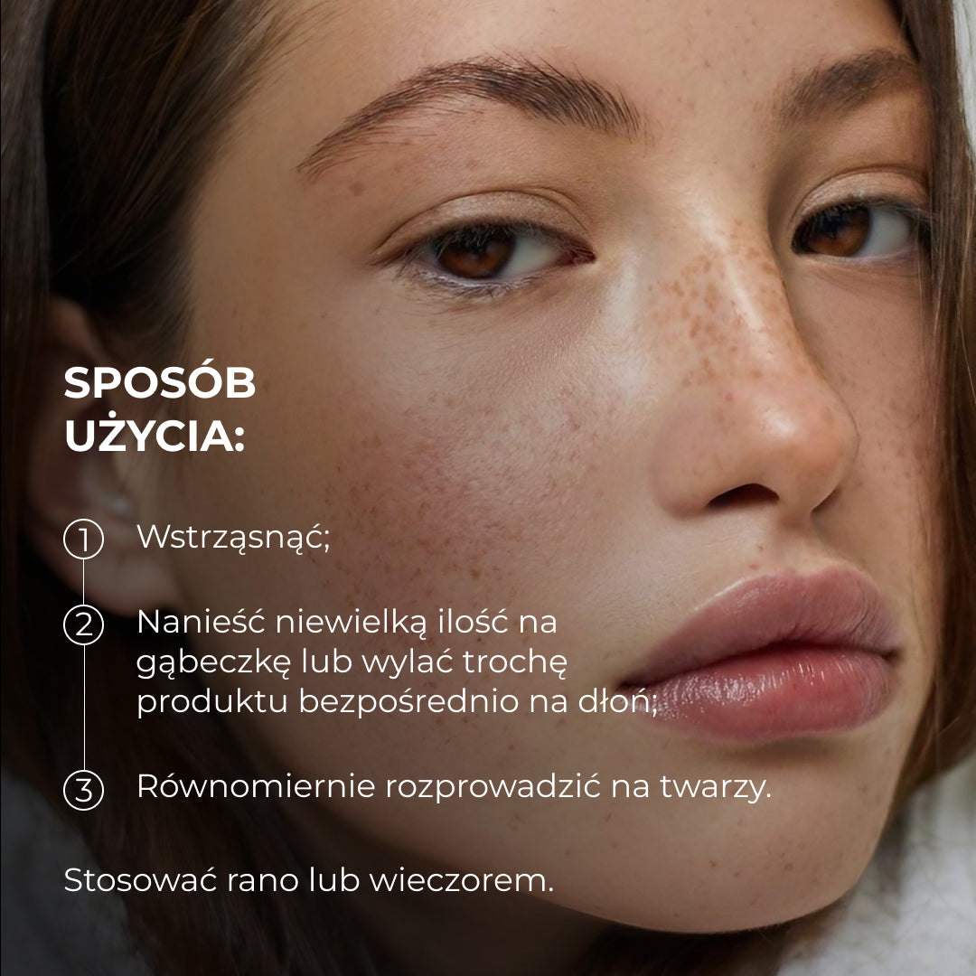 Sposób użycia: Przed użyciem wstrząsnąć. Nałóż niewielką ilość toniku na wcześniej oczyszczoną skórę za pomocą gąbki lub wylej trochę produktu bezpośrednio na dłoń i równomiernie rozprowadź na twarzy.