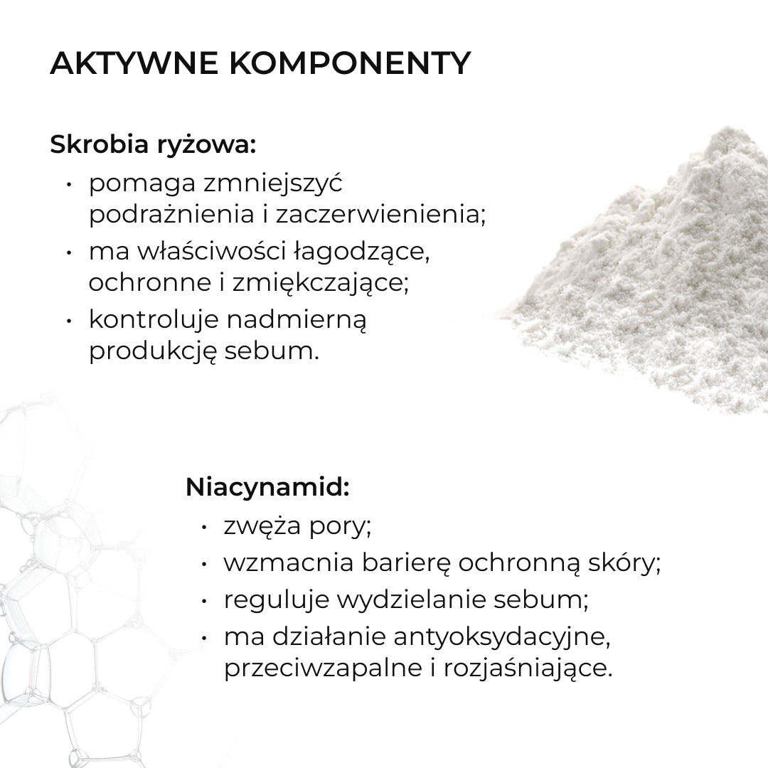 Skrobia ryżowa nadaje skórze matowość, kontroluje nadmierną produkcję sebum, zapobiegając błyszczeniu się skóry, ma właściwości łagodzące, które pomagają zmniejszyć podrażnienia i zaczerwienienia. Niacynamid przyczynia się do zmniejszenia widoczności porów, wyrównania kolorytu skóry oraz redukcji przebarwień.