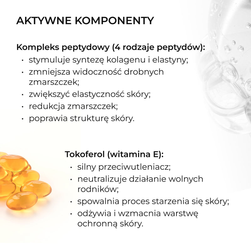 Kompleks peptydowy (4 rodzaje peptydów) – Palmitoyl Tripeptide-1 oraz Palmitoyl Tetrapeptide-7: stymulują syntezę kolagenu i elastyny, zmniejszając pojawianie się drobnych zmarszczek oraz zwiększając jędrność skóry.