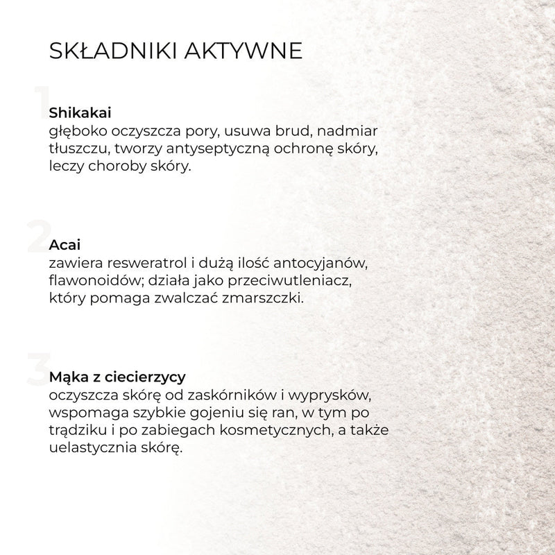 - Nałóż niewielką ilość ubtanu na dłoń, dodaj wodę i wymieszaj palcem do uzyskania konsystencji pasty. Nałożyć na wilgotną twarz lekkimi ruchami masującymi, zwracając szczególną uwagę na strefę T, a następnie spłukać wodą. Można stosować 2 lub 3 razy w tygodniu.