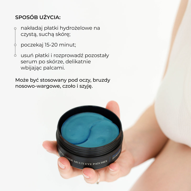 Sposób użycia: Nałóż hydrożelowe płatki na czystą, suchą skórę pod oczami na 15-20 minut rano lub wieczorem. Można je również nakładać na fałdy nosowo-wargowe, czoło lub szyję. Po użyciu, wyrzuć płatki, a pozostały na skórze serum, delikatnie wklep palcami w skóre.