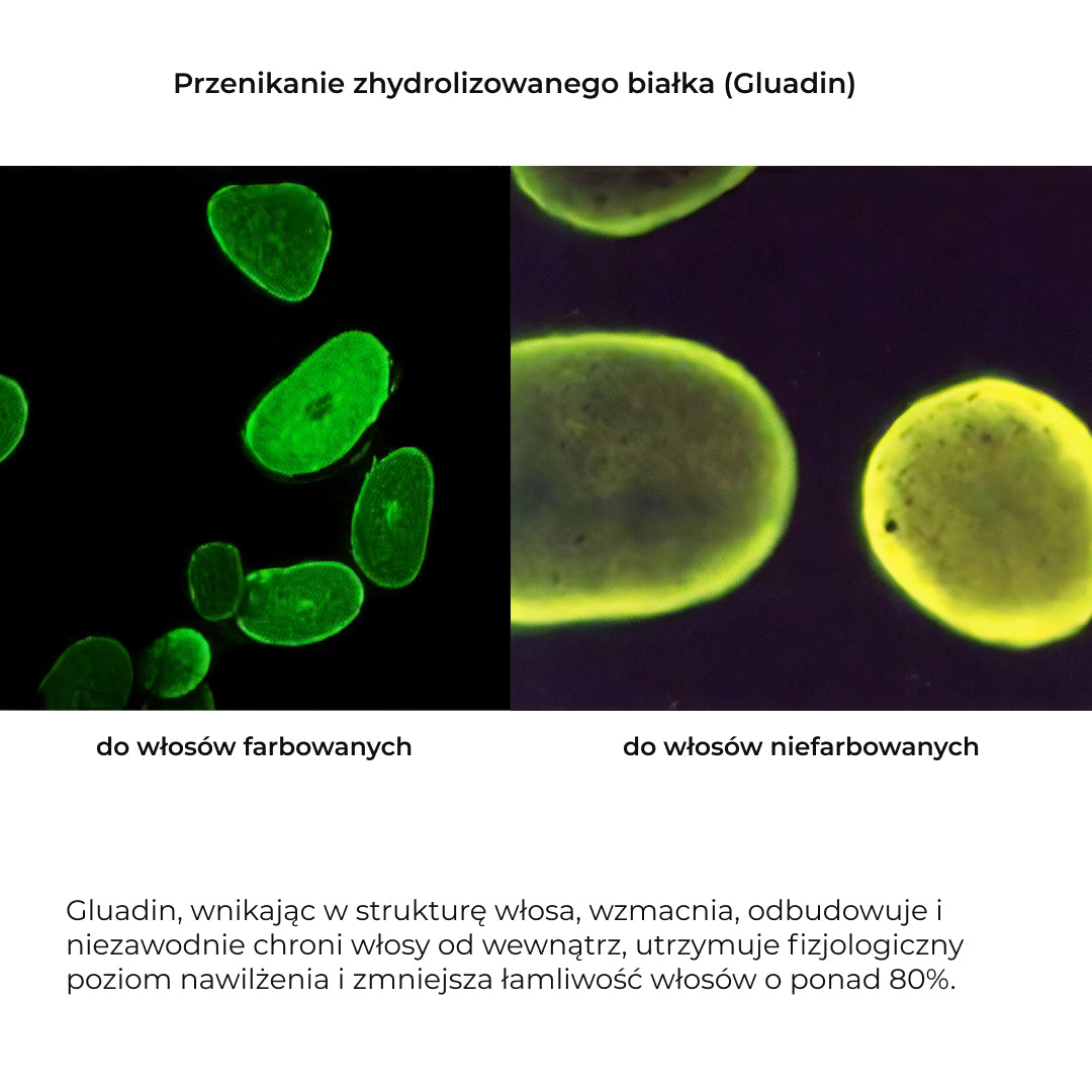3. Hydrolizowany protein pszenicy Gluadin® chroni włosy od wewnątrz, zmniejszając ich łamliwość o ponad 80%. Zapewnia odbudowę i restrukturyzację włosów, tworząc warstwę ochronną wokół naskórka. Utrzymuje fizjologiczny poziom nawilżenia w warstwie rogowej skóry głowy, poprawia równowagę wodną włosów, nadając im połysk i elastyczność.