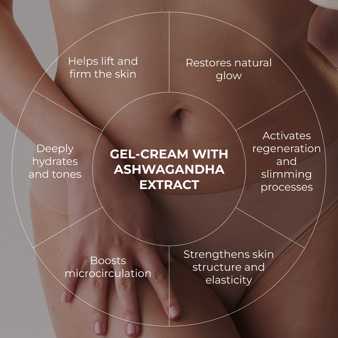 Żel-krem ujędrniający do ciała z ekstraktem z Ashwagandhy to silny środek antycellulitowy, wzbogacony ekstraktem z Ashwagandhy, który wspomaga efektywne modelowanie skóry i głębokie nawilżenie. Dzięki specjalnie dobranym składnikom aktywnym, ten żel-krem nie tylko zwiększa jędrność skóry, ale także pomaga zmniejszyć widoczność cellulitu, poprawiając jej strukturę i elastyczność.