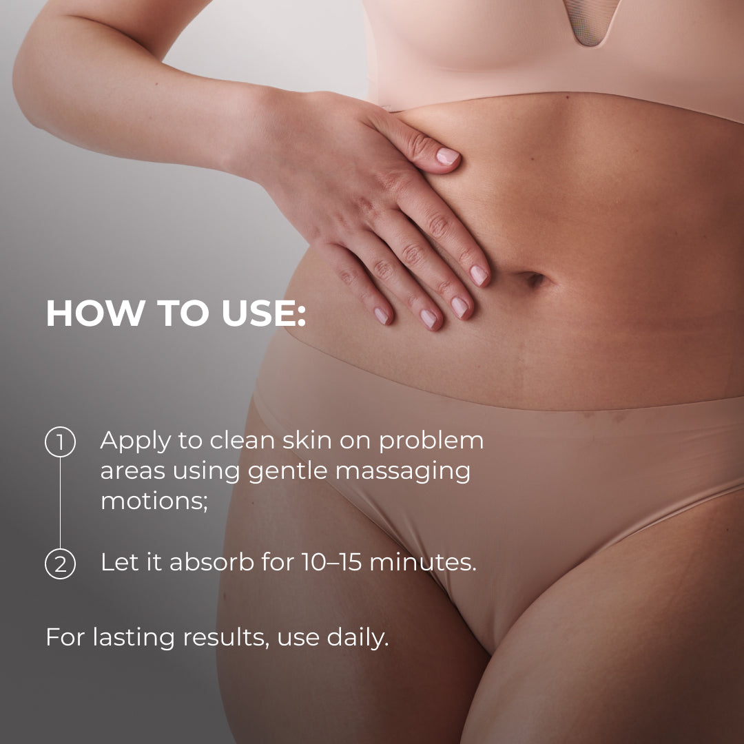 Sposób użycia: nałożyć na oczyszczoną skórę problematycznych partii ciała, wykonując lekkie ruchy masażowe. Pozostawić do wchłonięcia na 10-15 minut.