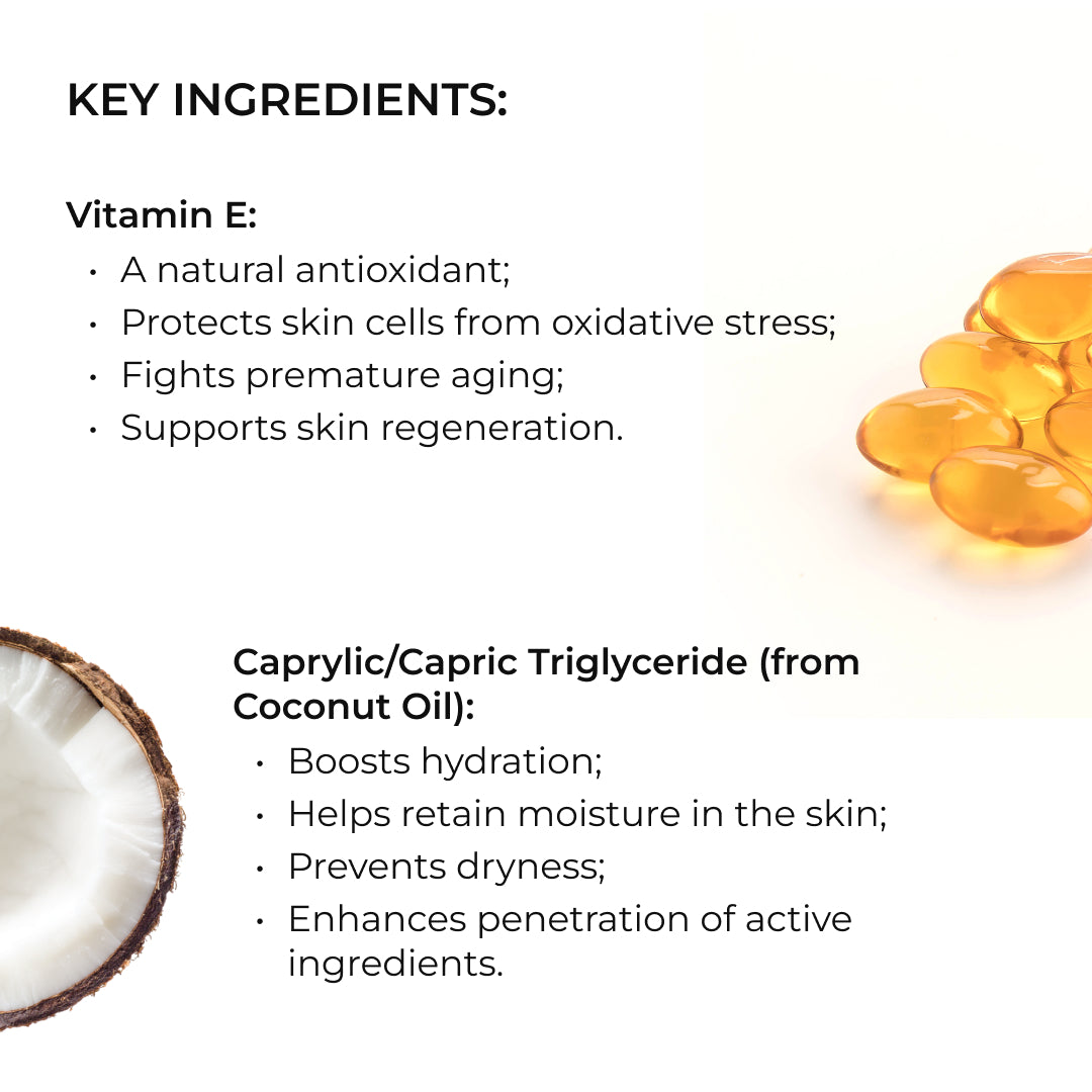 Witamina E – naturalny antyoksydant, który chroni komórki przed stresem oksydacyjnym, walczy z przedwczesnym starzeniem się i wspomaga regenerację skóry. Trójglicerydy kaprylowe delikatnie nawilżają skórę, poprawiając jej teksturę.