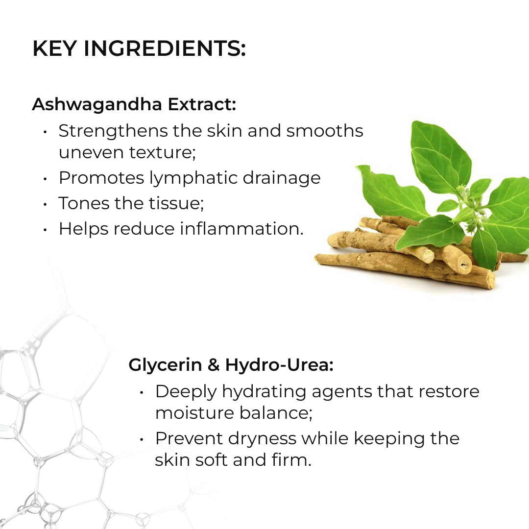 Ekstrakt z Ashwagandhy – naturalny adaptogen, który wzmacnia skórę, poprawia drenaż limfatyczny i tonizuje tkanki. Dzięki swoim właściwościom antyoksydacyjnym, Ashwagandha zwiększa elastyczność skóry, redukuje stany zapalne i wspomaga wyrównaną strukturę skóry. Gliceryna i hydrourea to dwa potężne składniki nawilżające, które przywracają równowagę wodną skóry, zapobiegają jej wysuszeniu i wspierają jej miękkość oraz jędrność.