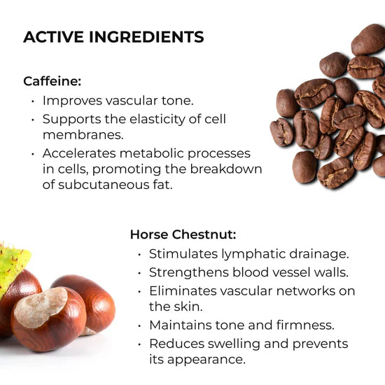 Dzięki aktywnemu kompleksowi liposomalnemu poprawiają krążenie krwi, wzmacniają naczynia krwionośne i wspomagają skuteczną redukcję cellulitu.