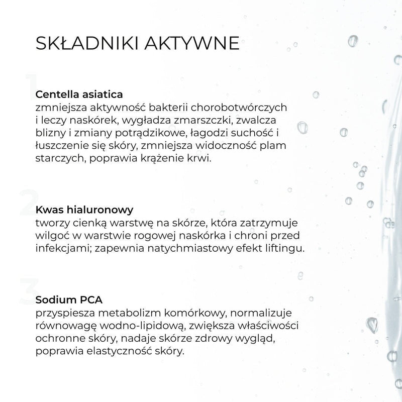 Serum hialuronowe głęboko nawilża warstwy skóry, zapobiega starzeniu się i przywraca młodość skóry, odbudowuje i chroni, utrzymuje wilgoć wewnątrz skóry, widocznie redukuje zmarszczki, napięcie skóry i nadaje jej blasku. Właściwości surowicy z kwasem hialuronowym są znacznie wzmocnione podczas masażu.