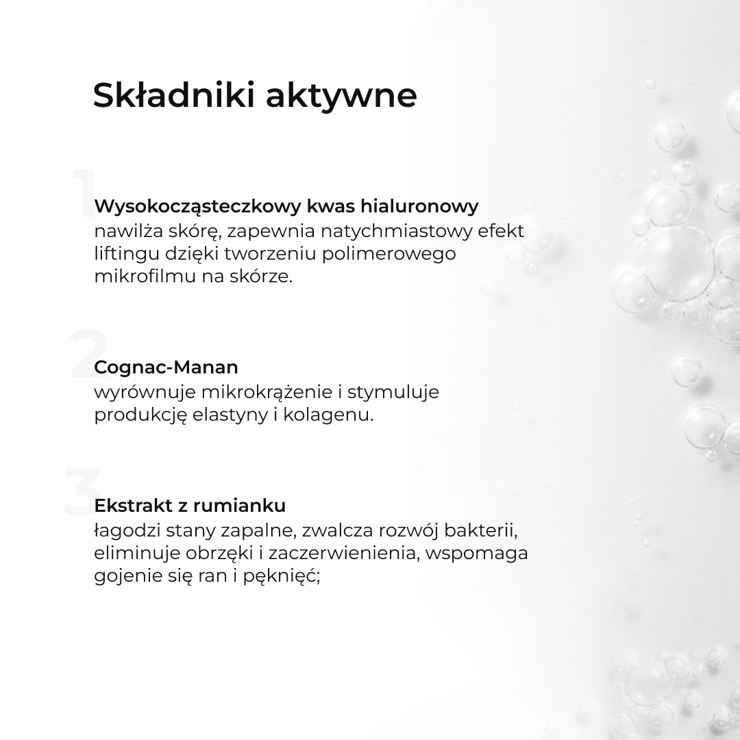 A składniki nawilżające i odżywcze zapewnią długotrwałe nawilżenie, poprawią elastyczność i jędrność skóry, nadają jej blasku i równomiernego kolorytu.