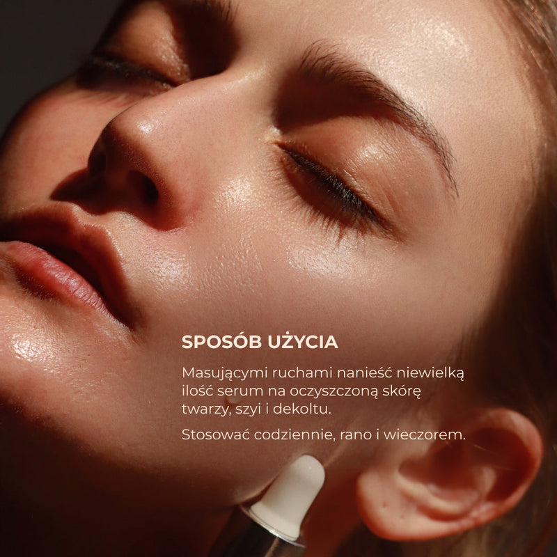 Na oczyszczoną skórę nałóż kilka kropli serum hialuronowego, masującymi ruchami, rozprowadż na skórze twarzy, szyi i dekoltu. Serum można stosować dwa razy dziennie, również jako aktywny środek pod krem.